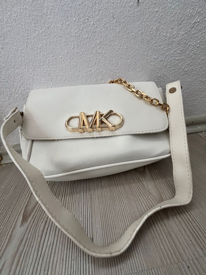 Beyaz deri kadın omuz çantası, tokalı altın detay ve zincir aksanlı, minimalist baskılı tasarıma sahip trend sokak stili için uygun çanta.