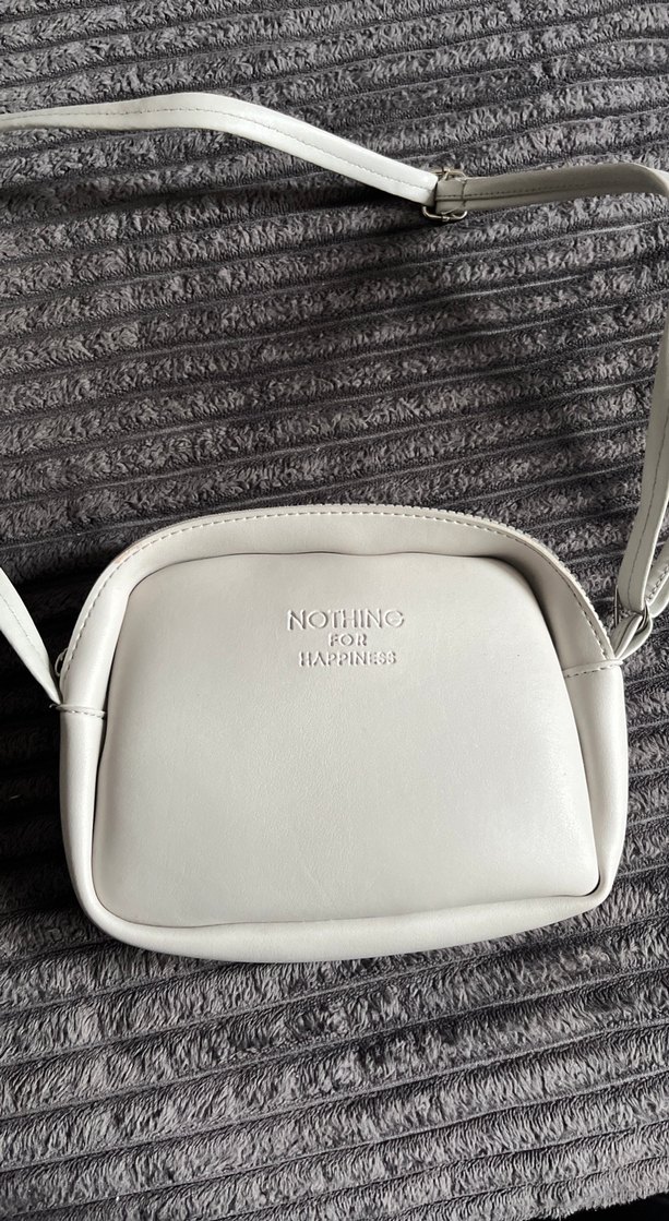 Beyaz deri, tokalı kayışlı, desensiz ve minimalist tasarımlı kadın omuz çantası. Günlük kullanıma uygun.