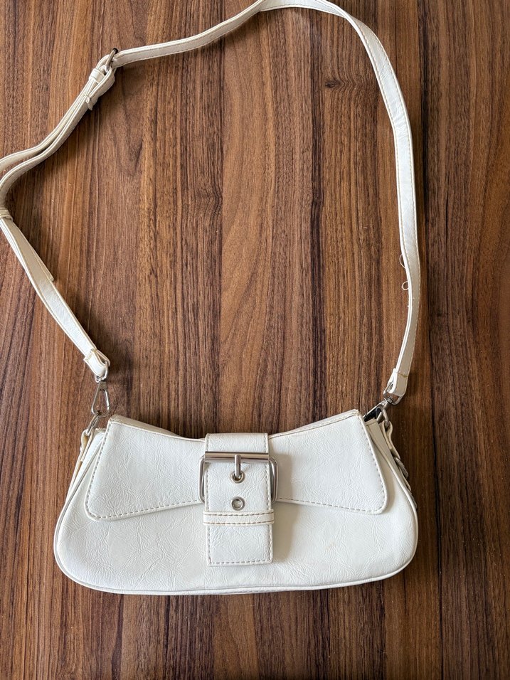 Beyaz deri kadın omuz çantası, tokalı kapak ve minimalist bohem tarzıyla dikkat çekiyor. Ayarlanabilir askısı ve desen içermeyen yüzeyi günlük kullanıma uygundur. arka yüzde lekelenmeler mevcuttur.