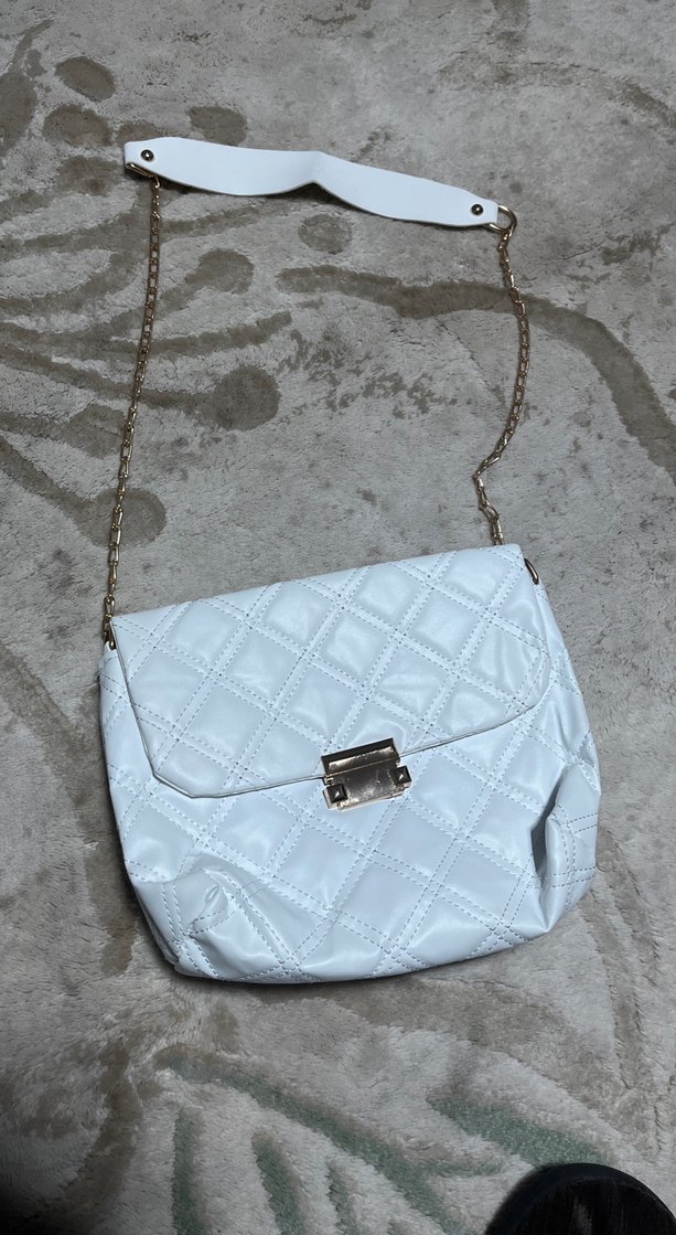 Beyaz deri kadın çantası, tokalı kapama ve zincir askıya sahiptir. Pastel renkli, kapitone desenli ve günlük kullanıma uygundur.