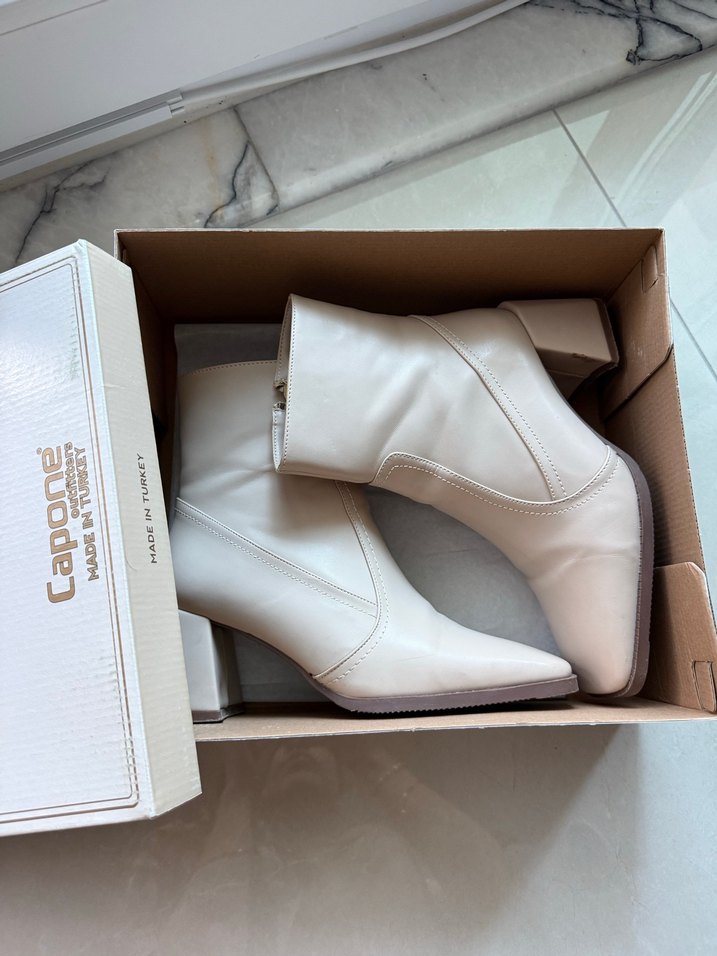 Capone marka Beyaz deri kadın botları blok topuk ve fermuarlı tasarımla modern ve trend bir görünüm sunar.