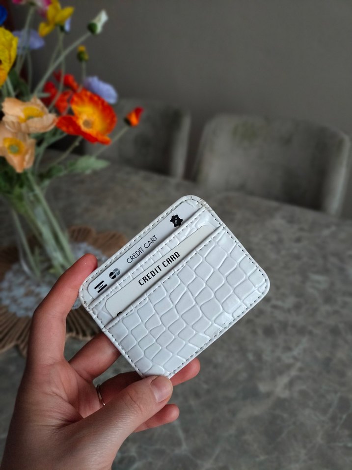 Beyaz deri kartlık, günlük kullanıma uygun, sokak modası tarzında.