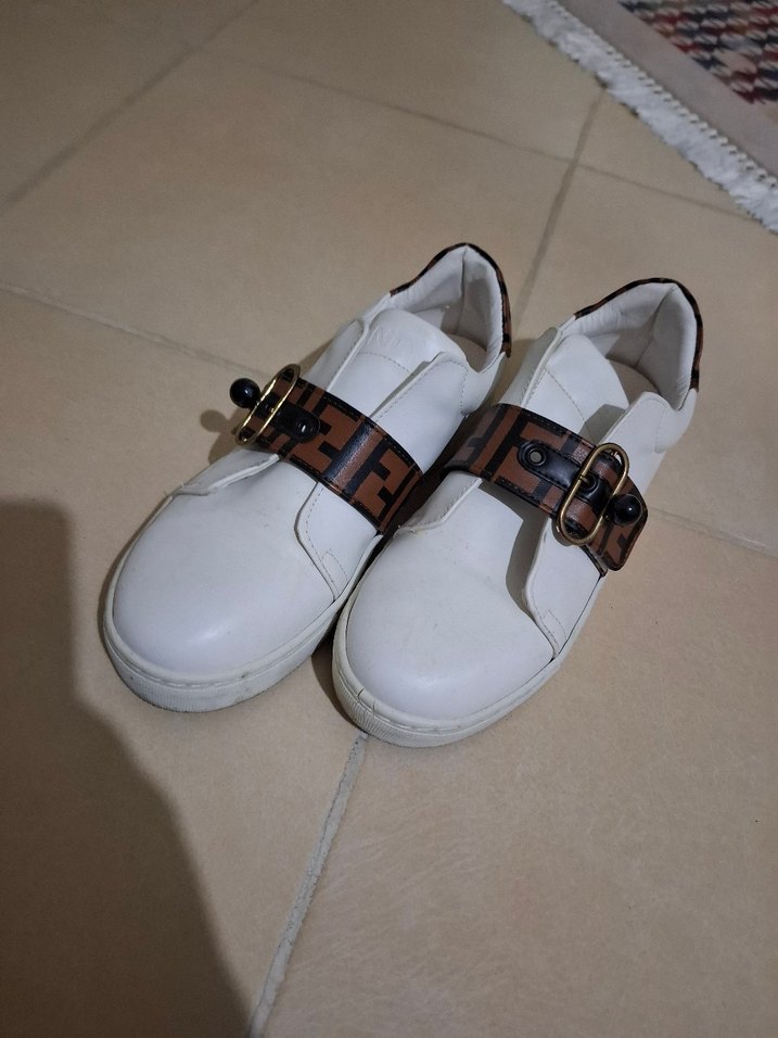 Beyaz deri, parlak yılan desenli kemerli ve blok topuklu sneaker, trend rahat sokak stili için uygundur. Günlük kullanım için konforludur. fendi ital üründür 1 kac kez giyildi