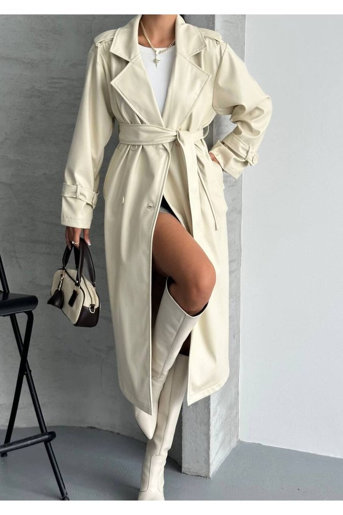 Beyaz deri trençkot, kemerli ve notched yaka detaylıdır. Strappy kollu, regular fit ve günlük kullanıma uygundur.