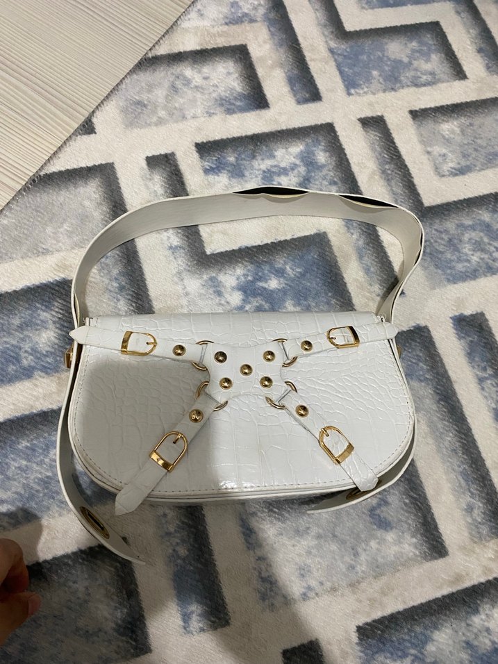 Beyaz deri, yılan desenli, kemerli detaylara sahip kadın çantası. Sokak modasına uygun, şık ve hafif renk tonlarında.