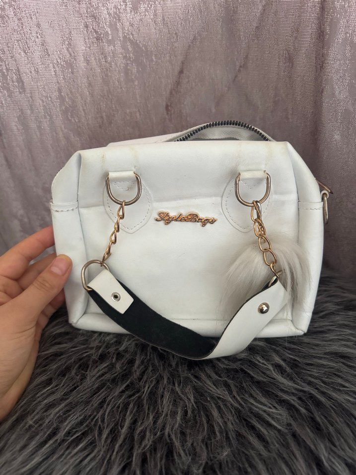 Kürklü detaylı beyaz deri kadın çantası, altın zincir ve siyah askıya sahip. Trendy günlük sokak stili için uygun. Bazı yerlerinde sarı lekeler var.uzun askısı da mevcuttur