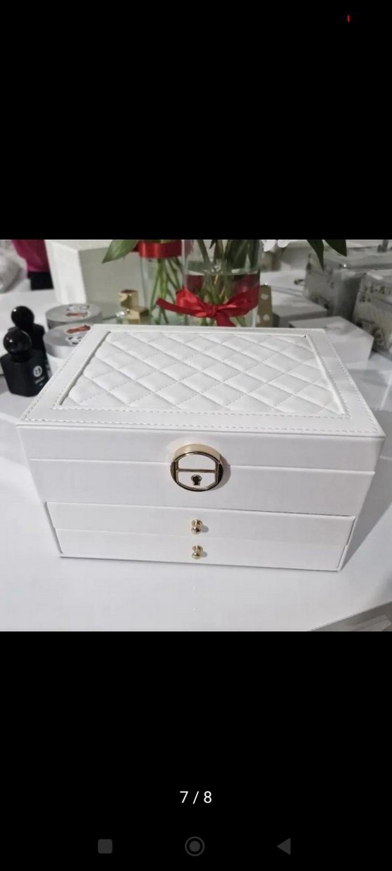 Kilitli bölmeli, beyaz deri kaplamalı, kapitone desenli makyaj organizer kutusu. Kozmetiklerinizi düzenli tutar.