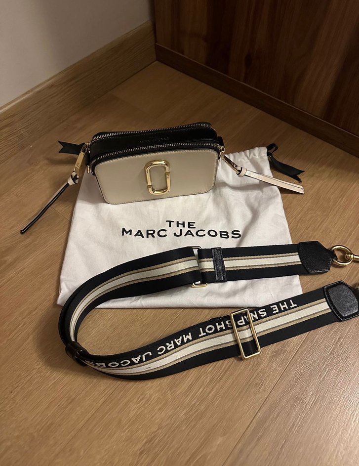 Beyaz deri Marc Jacobs çapraz çanta, baskılı tasarım ve ayarlanabilir çizgili kemerle günlük kullanıma uygun. Trendy, rahat sokak stili için ideal.
