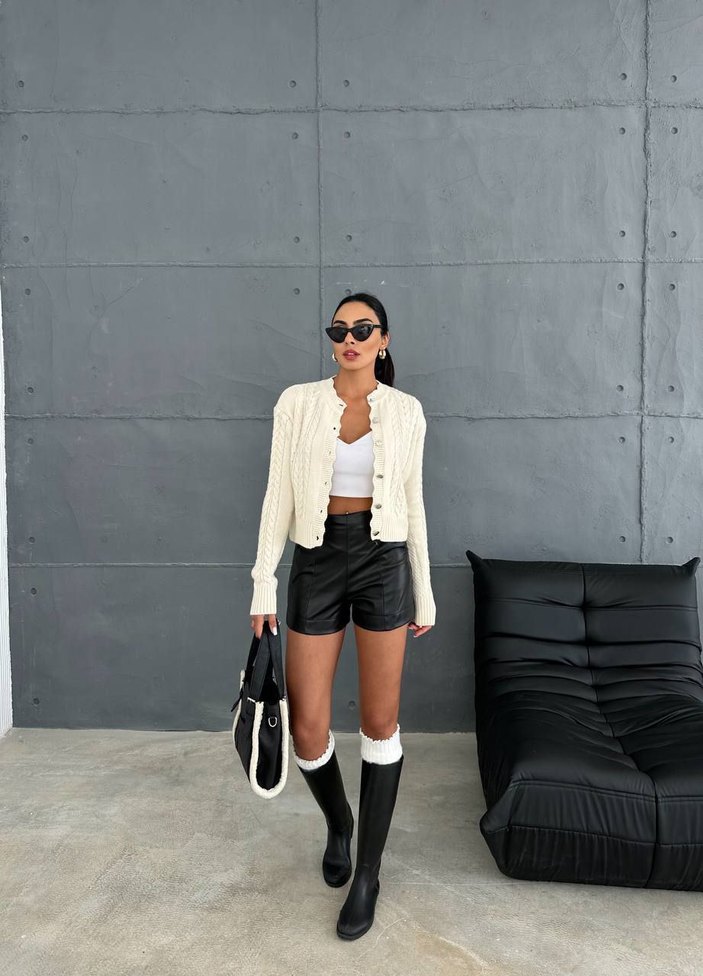 2li Düğmeli örgü detaylı kemer boy hırka Standart beden Yine en en iyi fiyat ile Beyaz deri mini şort, sokak stili ve günlük rahat kullanıma uygun, vücuda oturan kesime sahiptir. Zahmetsiz şıklık sunar.
