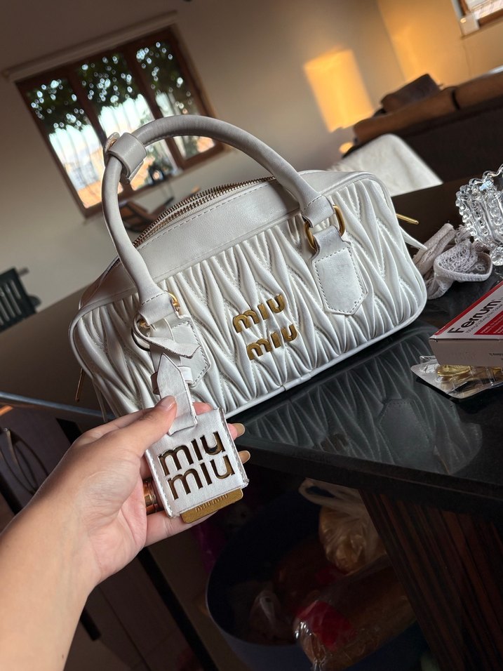 Beyaz deri çanta, fırfırlı tasarım ve baskılı detaylarla. Altın renk Miu Miu logosu bulunur. Modern klasik stil, günlük kullanım için uygundur.