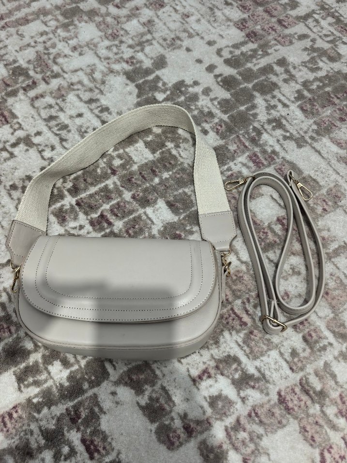 Beyaz deri, kemerli ve yılan derisi desenli kadın çanta. Modern klasik tarzda, iki farklı askısı ile günlük kullanıma uygun.