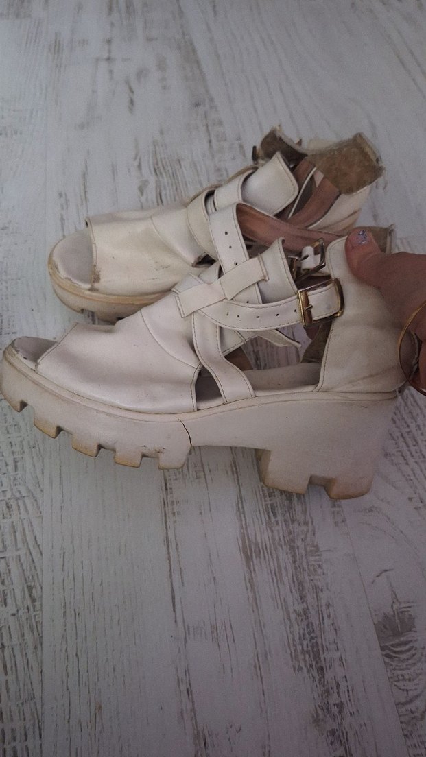 Beyaz deri, tokalı bantlı platform topuklu ayakkabı, pastel tonlarda ve sokak stiline uygun, günlük kullanıma uygun.