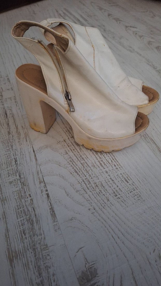 Beyaz deri, parlak yüzeyli platform topuklu ayakkabı. Tokalı ve fermuarlı, günlük kullanıma uygun sade bohem tarzda.