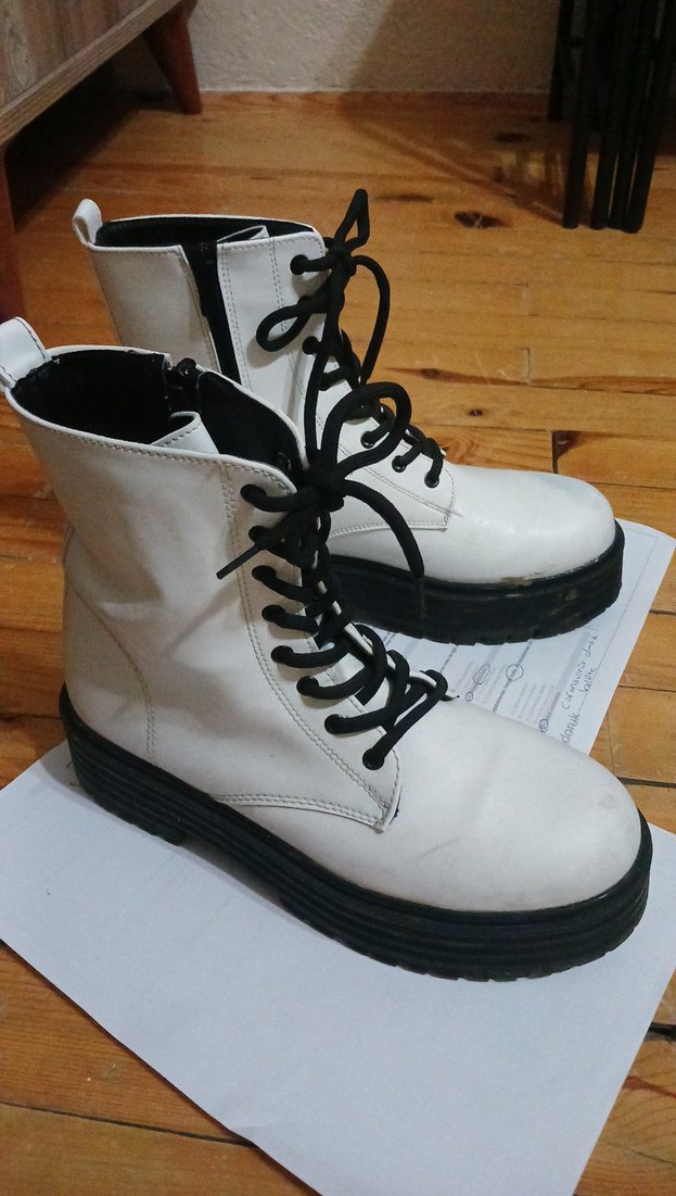 Beyaz deri, siyah bağcıklı, platform topuklu botlar. Grunge punk ve gotik tarzıyla günlük kullanıma uygun, zahmetsiz şıklık sunar. deposu yırtığı yoktur Normalde 39 numara ama kalıbından dolayı bir tık dar geldiği için 38 numaralı kişiler için de uygundur en fazla 4 kere anca giyilmistir