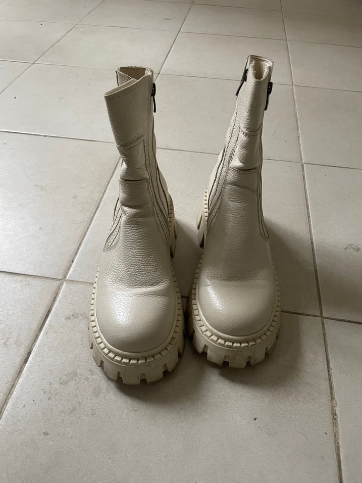 Beyaz deri platform topuklu kadın botları, minimalist ve normcore tarz sunar. Desensiz, gri tonlu bu botlar, günlük kullanım için şıklığı kolayca yakalar.