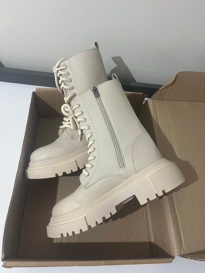 Beyaz deri platform topuklu botlar, yanlarında kolay kullanım için fermuar içerir. Ayrıca bağcıklıklıdır. Hiç giyilmedi hediye geldi tarzıma uygun olmadığı için satıyorum kutusu ile beraber gönderim olacaktır
