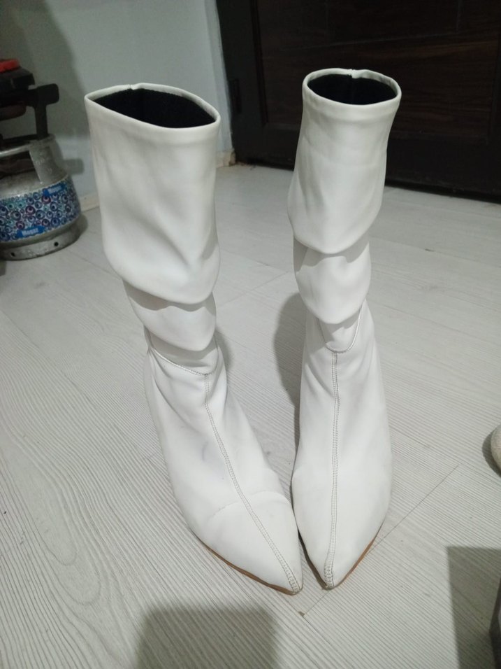 Beyaz deri, pliseli detaylara sahip stiletto topuklu çizme, minimalist ve şık sokak tarzı sunar. Günlük kullanım için uygundur.