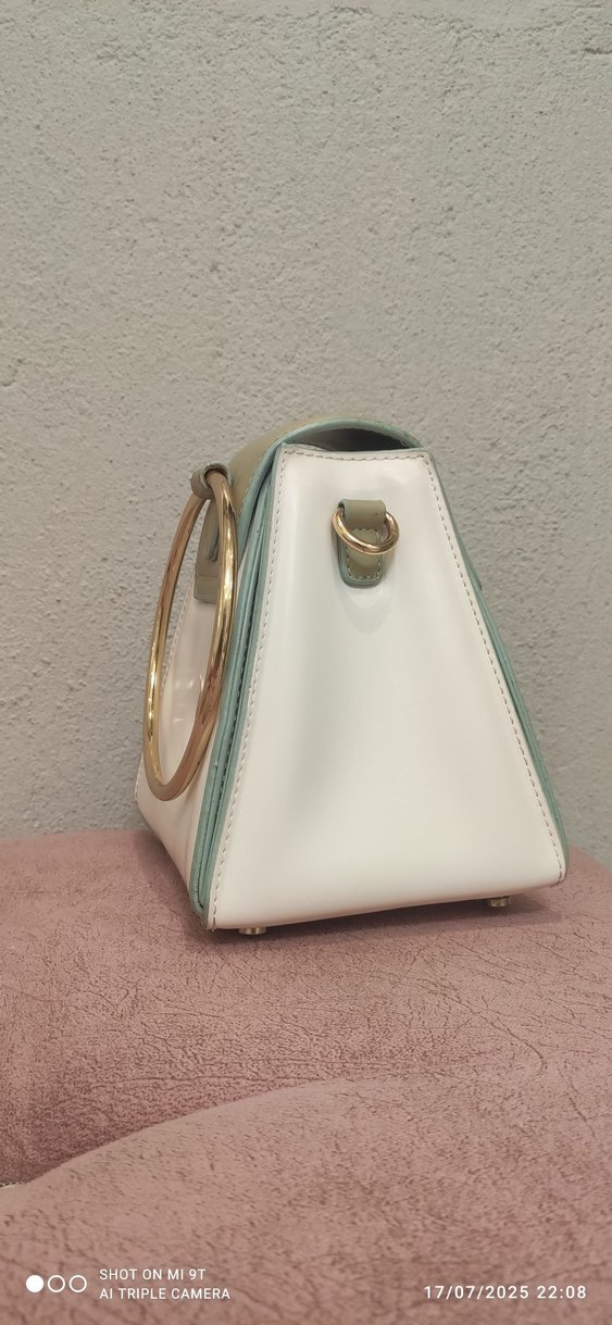 beyaz deri kadın çanta, püskül detayı ve altın renkli kulp ile minimalist ve çağdaş bir tasarıma sahiptir.