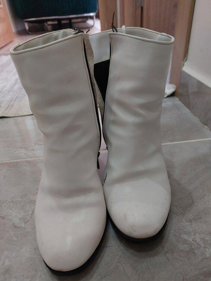 Beyaz deri, stiletto topuklu ve yan fermuarlı kadın botları. Düz, desensiz tasarımıyla sokak stiline uygun.