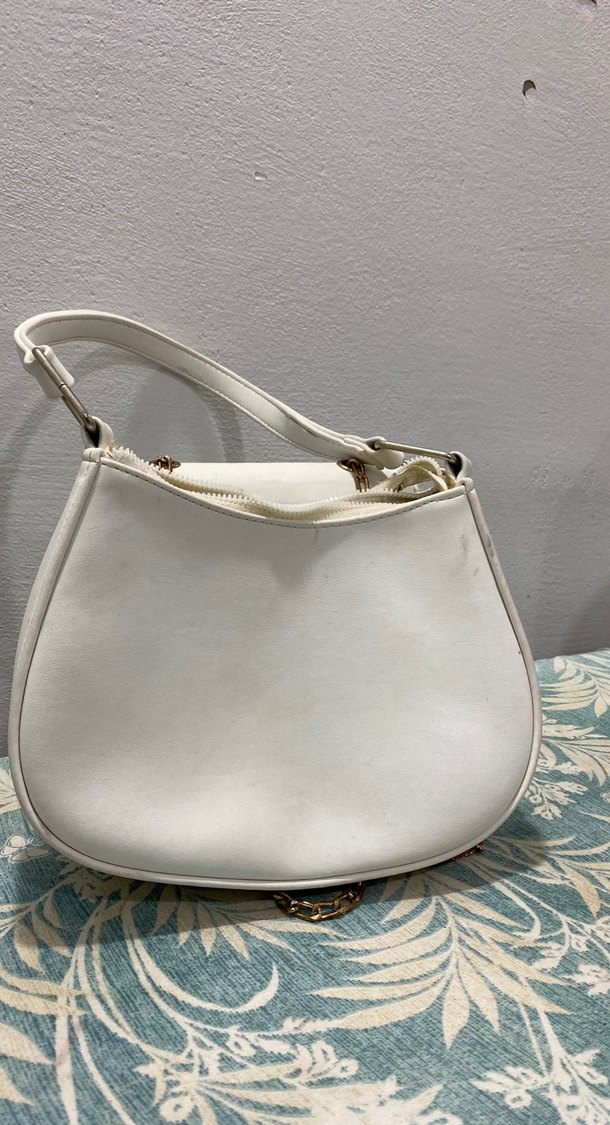 Tokalı askılı beyaz deri kadın çantası, minimal ve bohem tarzda. Düz yüzeyiyle günlük kullanıma uygun.