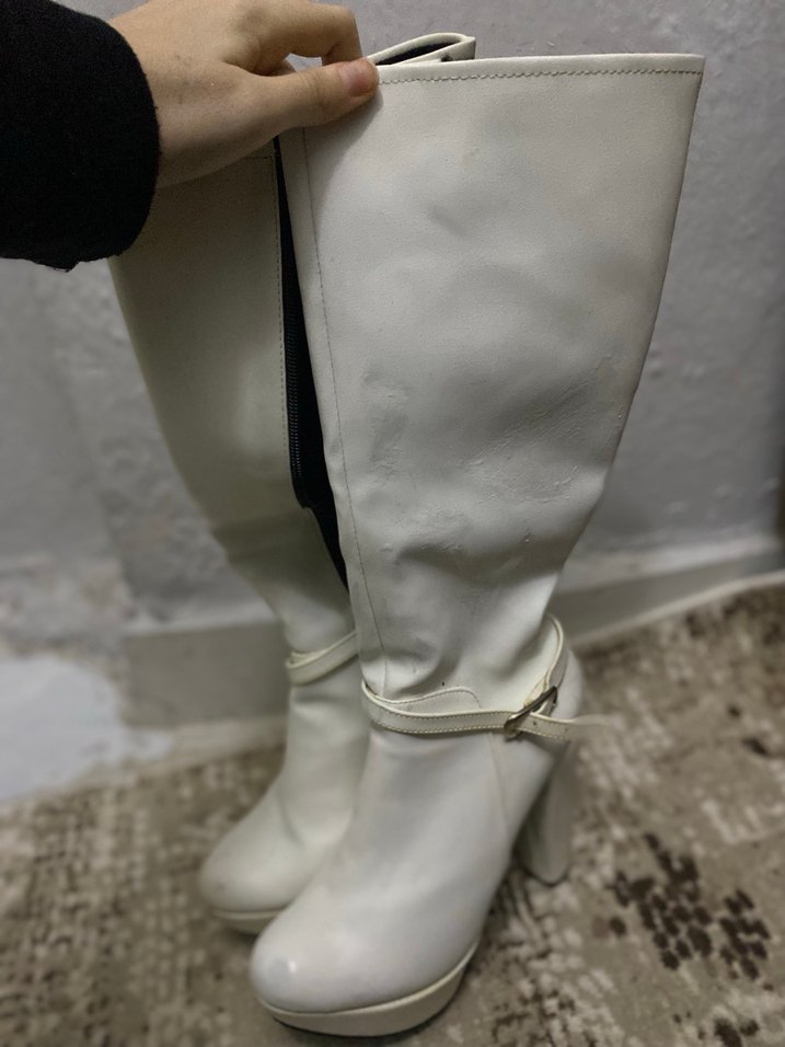 Beyaz deri dizüstü çizme, ince topuklu ve tokalı detaylıdır. Sokak modasına uygun, desensiz ve günlük kullanıma elverişlidir.