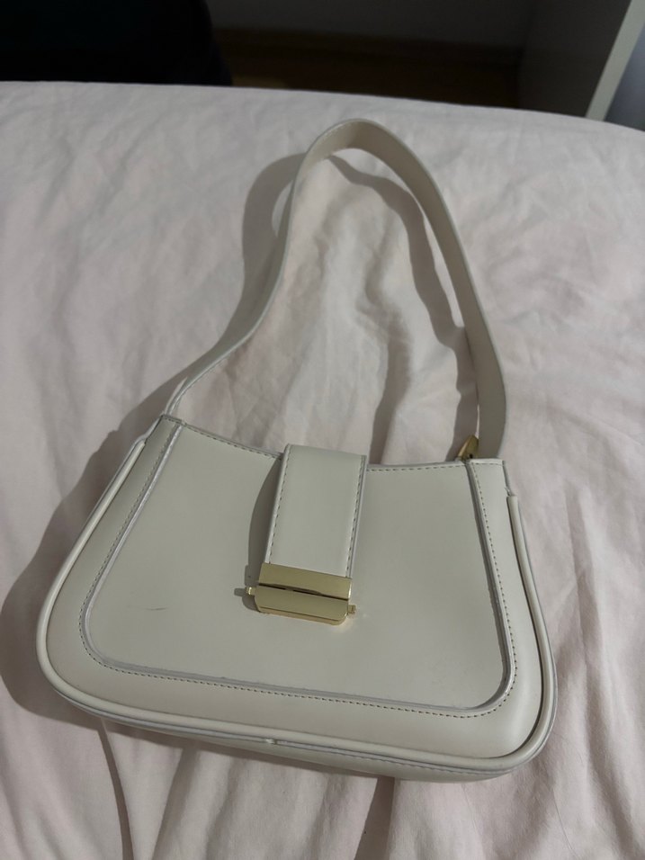 Beyaz deri, tokalı kadın çanta. Minimalist ve modern klasik tasarıma sahip, pastel tonlarda günlük kullanım için uygundur.