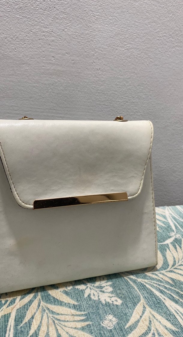 Beyaz deri tokalı kapaklı, şık altın detaylı kadın çantası, modern klasik tarzı yansıtır.