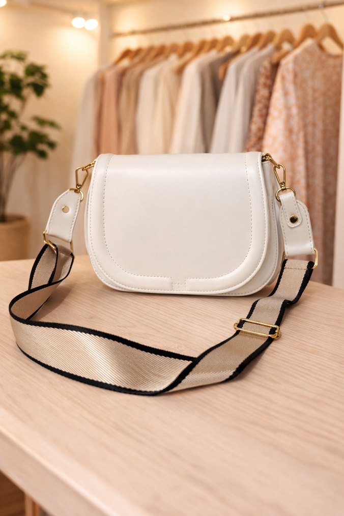 Bu beyaz deri kadın çanta, tokalı ve modern klasik tarzdadır. Açık renklidir, desensizdir ve günlük kullanıma uygundur. Ayarlanabilir askısı kullanışlıdır.