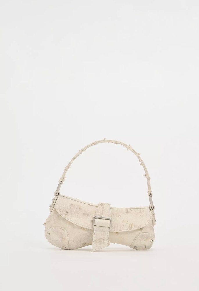 Bu beyaz deri kadın çanta, tokalı tasarımı ve minimalist stiliyle günlük kullanım için uygundur. Desensiz yüzeyi ve benzersiz şekli modaya uygun bir dokunuş katar.