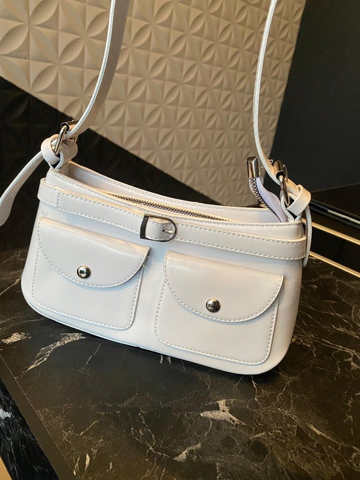 Beyaz deri, tokalı, ayarlanabilir askılı Çanta