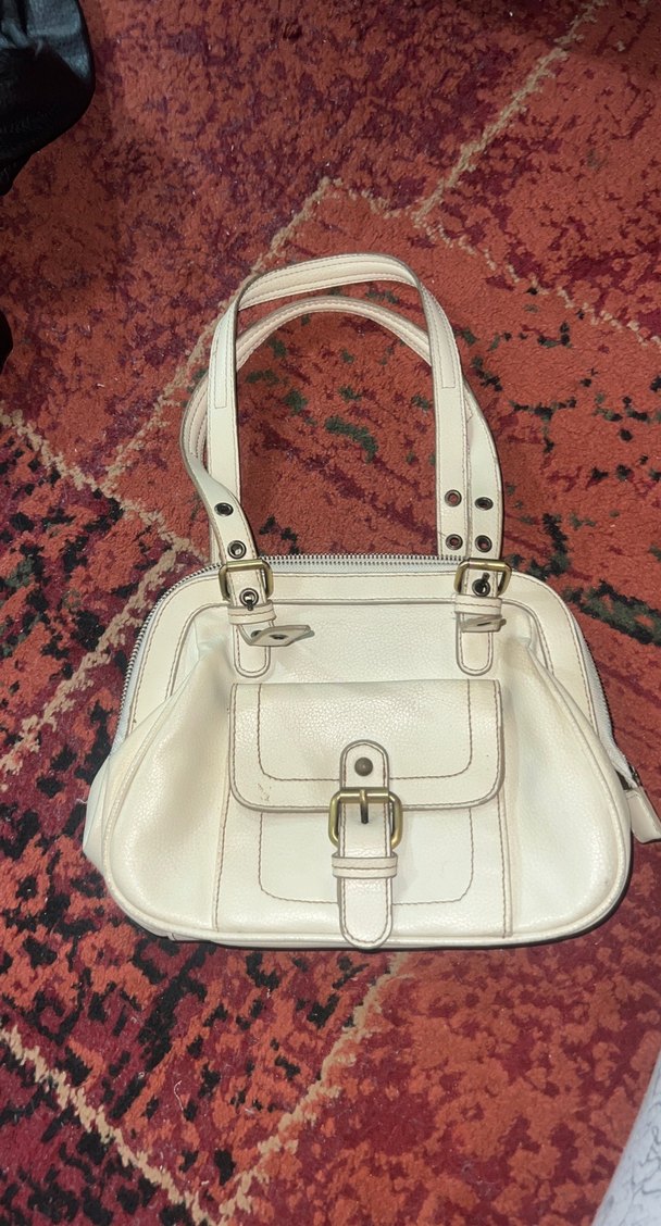 Beyaz deri kadın çanta, tokalı askılar ve ön cep tokasıyla bohem ve retro tarzda. Günlük kullanıma uygun.