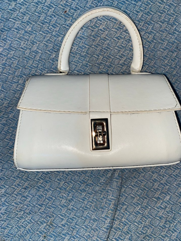 Beyaz deri malzemeden yapılmış, tokalı kapamalı modern klasik tarzda kadın çantası. Günlük kullanım için uygun, desen içermeyen şık tasarım.