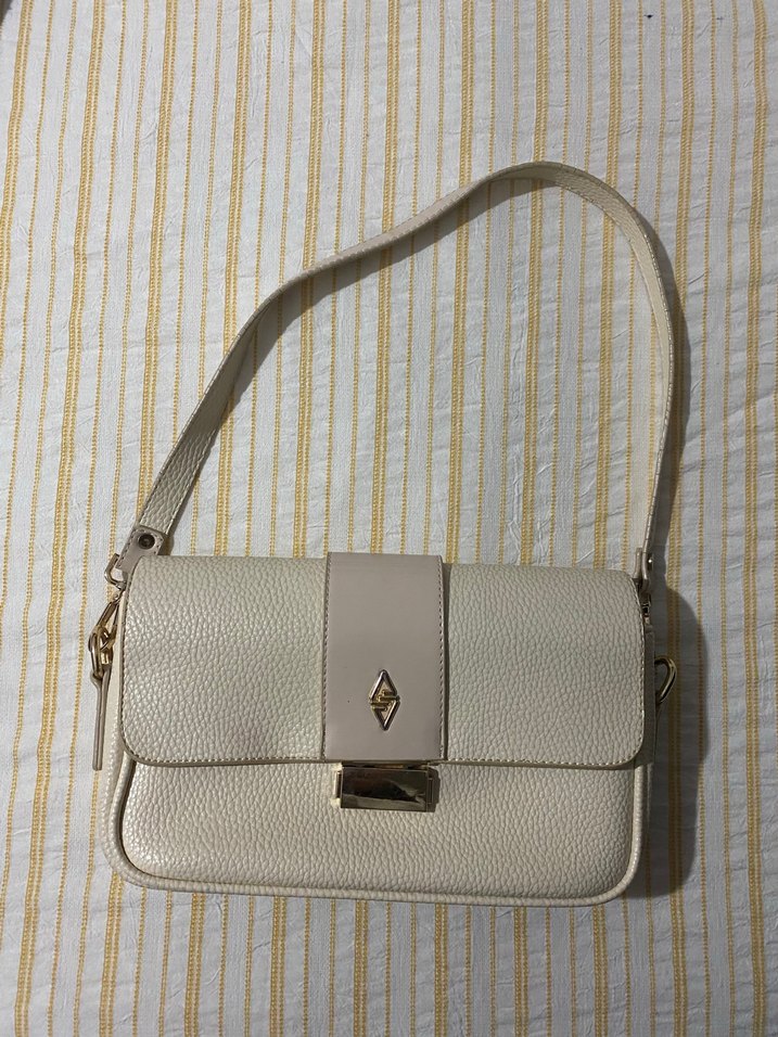 Pastel tonlarda beyaz deri kadın çanta, hafif yılan derisi deseni ve tokalı kapak detayına sahip. Modern klasik tarzıyla günlük kullanıma uygun.