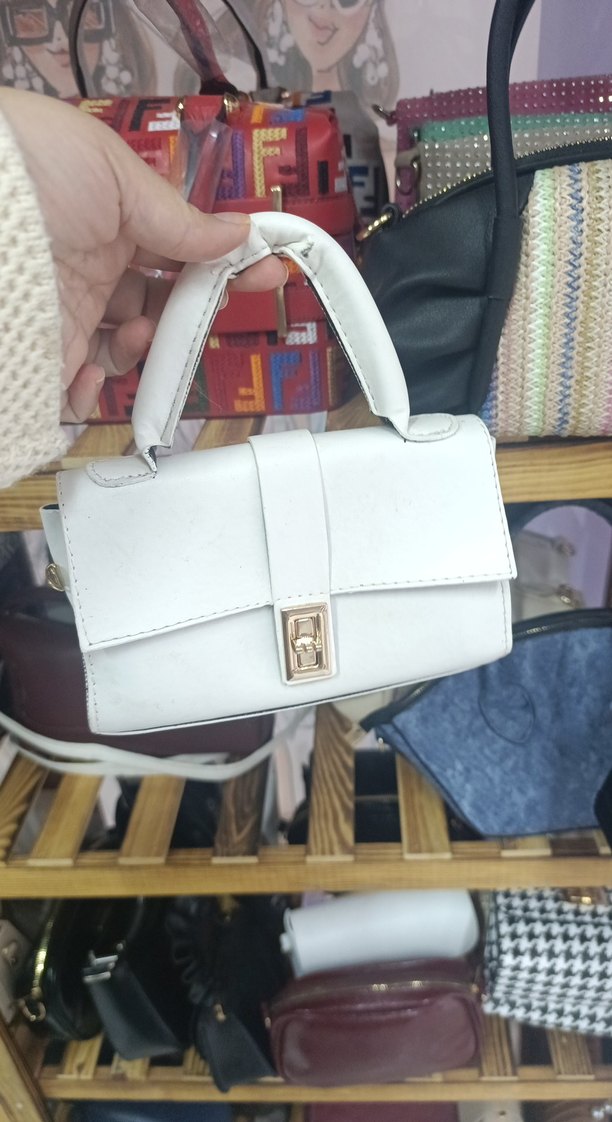 Beyaz deri, tokalı kapanışlı ve elde taşınabilir saplı kadın çanta. Günlük kullanıma uygun, trend sokak stiline uyum sağlar.