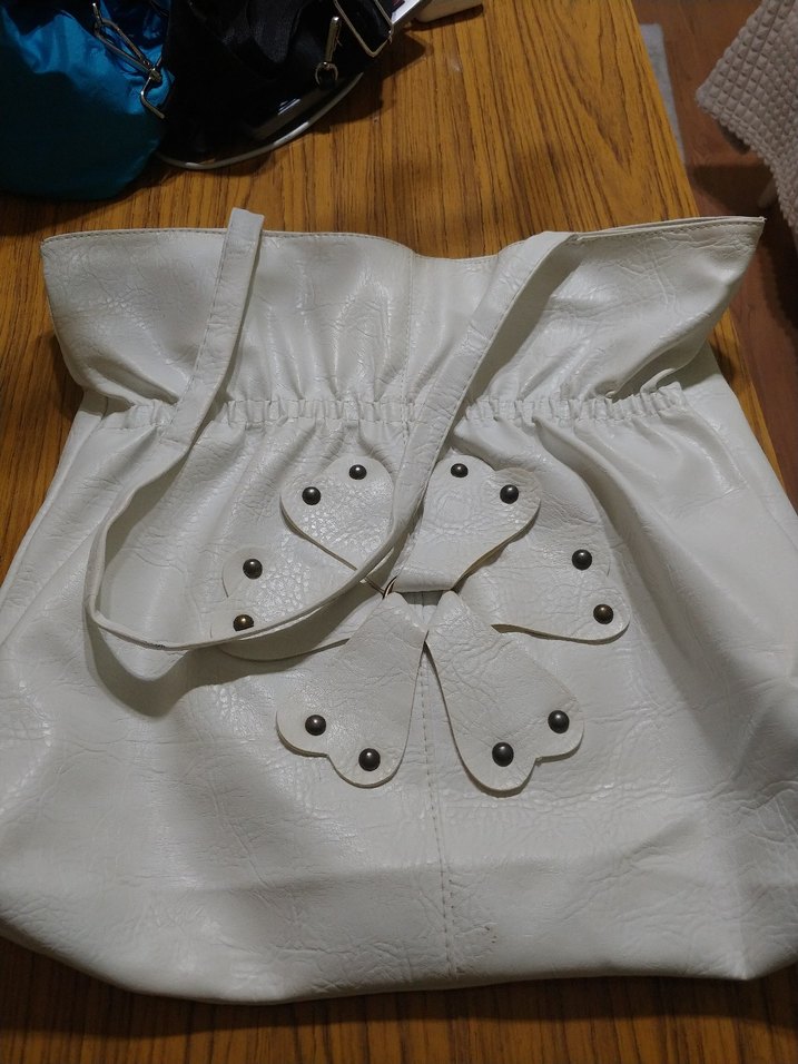Bu beyaz deri çanta, tokalı detayları ve parlak yüzeyiyle minimal ve bohem tarzı yansıtır, günlük kullanıma uygundur.