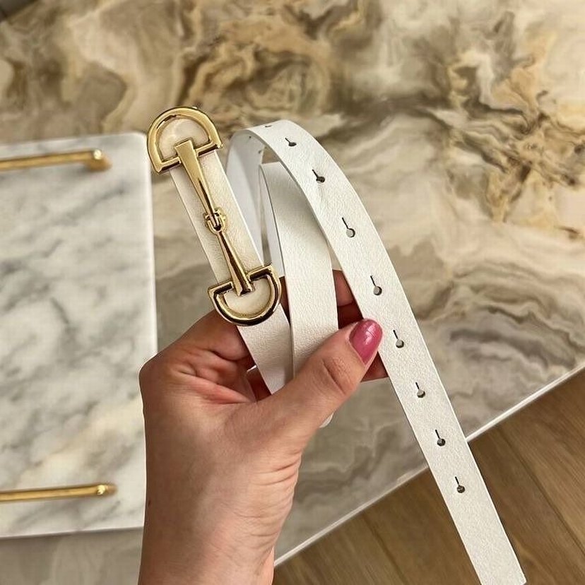 Altın renk tokalı beyaz deri kemer, Paris sokak modası ve trend casual tarzını yansıtıyor. Hafif rengiyle her kombine ferah bir dokunuş katıyor.