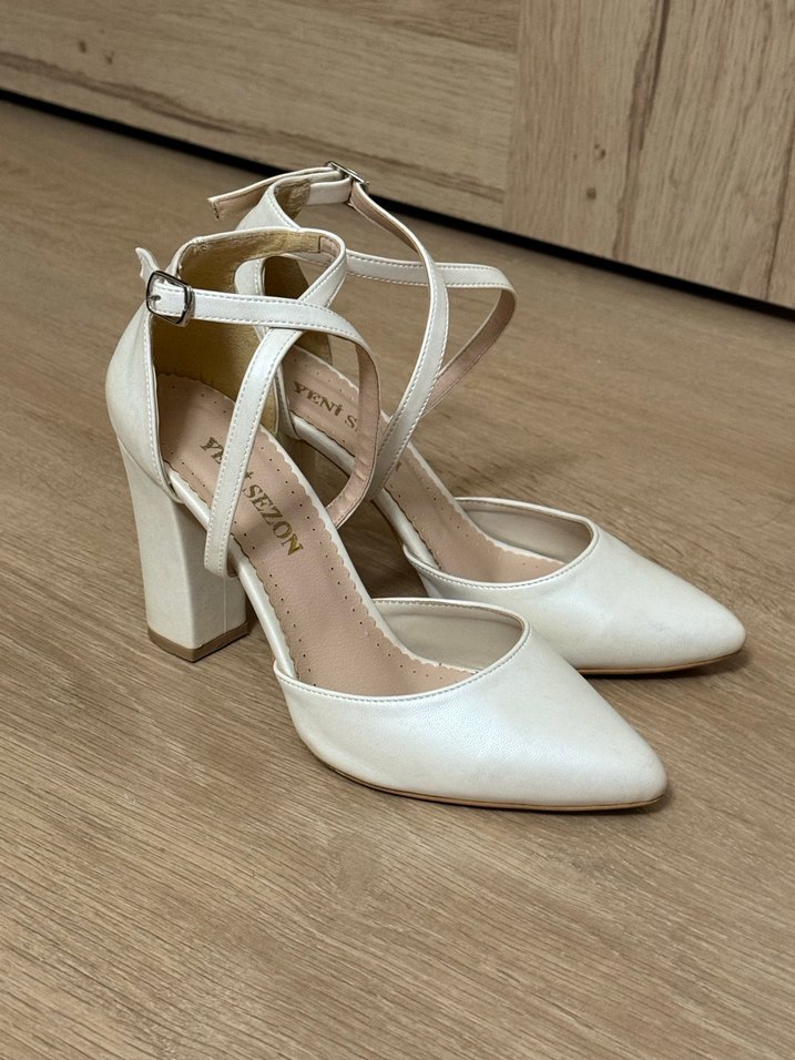 Beyaz Deri Tokalı Kadın Topuklu Ayakkabı