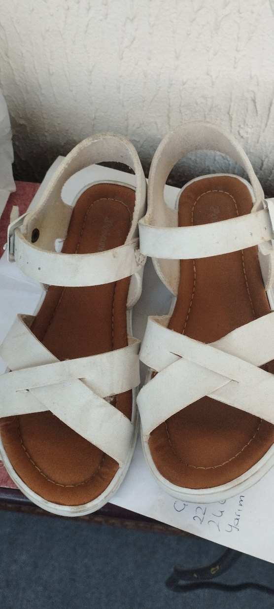Beyaz deri tokalı kız sandaletleri, sade bohem stilde ve desen içermeyen tasarıma sahip. Resimde göründüğü gibidir #ayakkabi #babet #kızayakkabi #yazlik #kizgiyim #sandalet