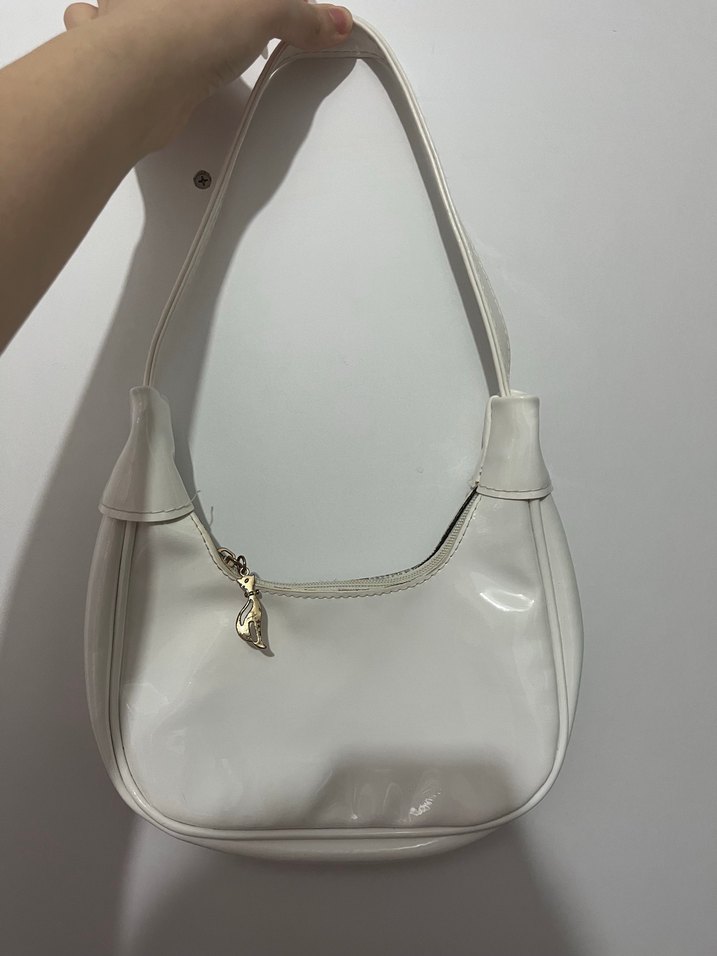 Beyaz deri, tokalı ve desen içermeyen minimalist tasarıma sahip kadın çantası, günlük sokak stiline klasik zarafet katıyor.