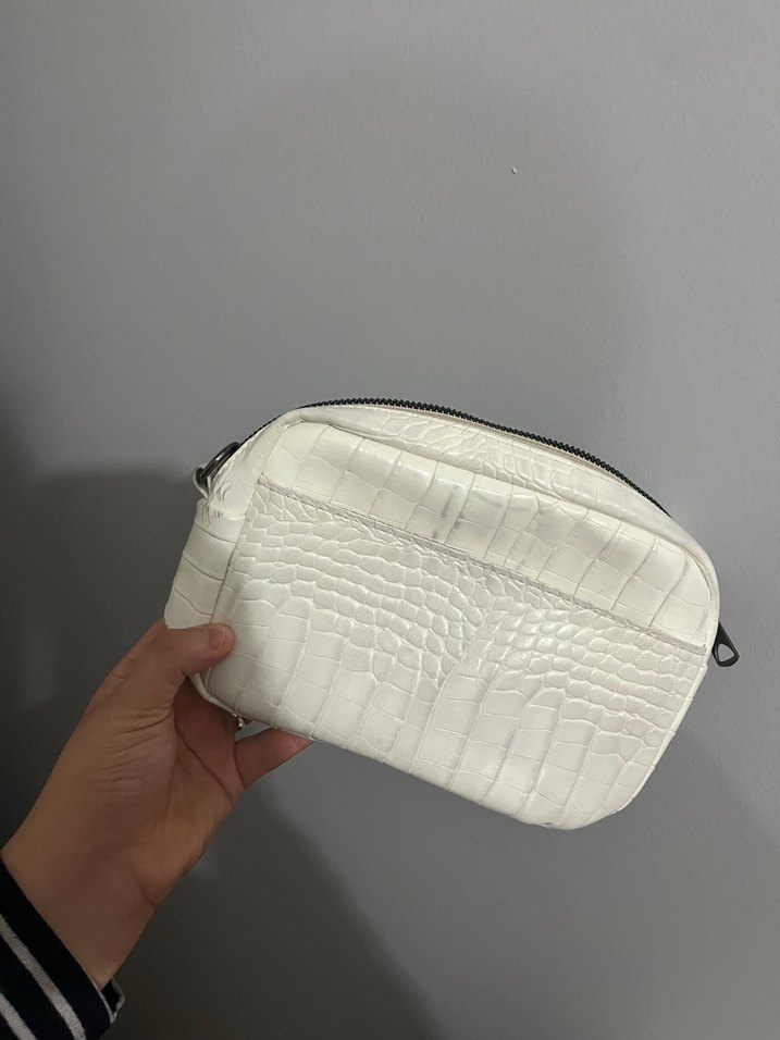 Beyaz deri, yılan desenli kadın çantası, fermuarlı ve günlük kullanıma uygun sokak stilinde.