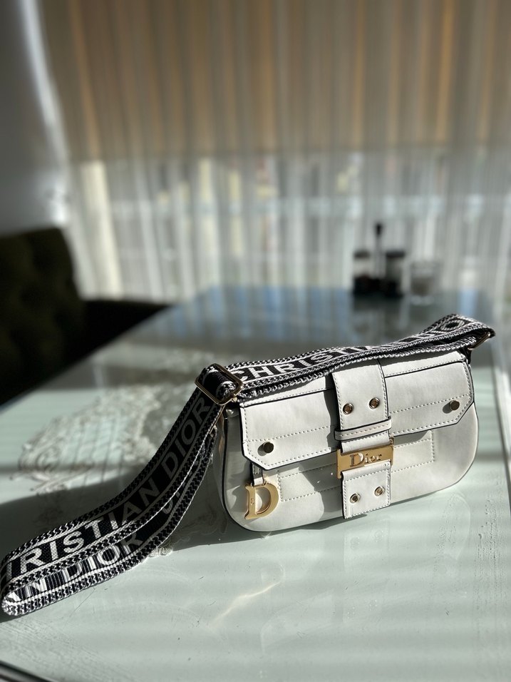 Beyaz deri, yılan desenli ve kemerli tasarıma sahip kadın çanta. Siyah-beyaz Dior askısı ile günlük sokak stiline uygun. Replikadır.