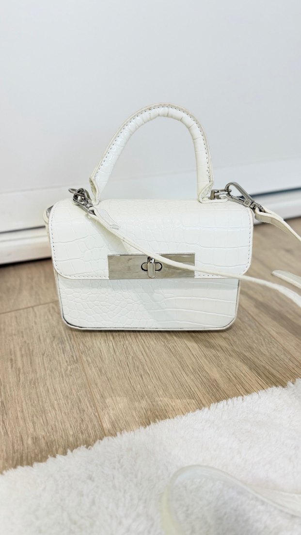 Beyaz deri yılan desenli çanta, tokalı kapanışa sahip. Üst saplı ve ayarlanabilir askılı, klasik şık tasarım.