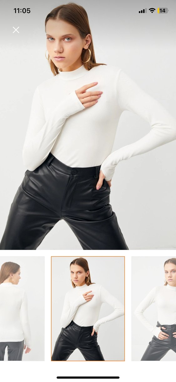 Bu beyaz deri bluz, yüksek yakası ve uzun kollarıyla minimalist ve şık bir görünüm sunar. Ofis ve günlük kombinlere zarif dokunuş katar.