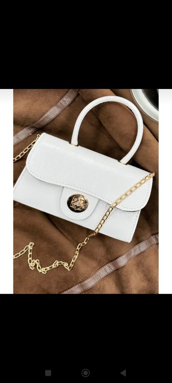 Parlak yılan desenli beyaz deri çanta, zincir detaylıdır. Modern klasik tarzı ve minimalist tasarımıyla günlük kullanıma uygundur.