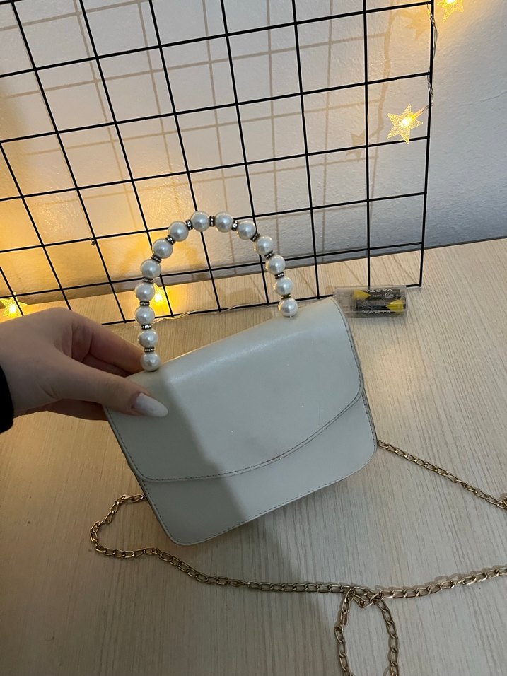Zincir ve inci detaylı beyaz deri kadın çantası, günlük kullanım için bohem tarzda, hafif ve trend tasarım.