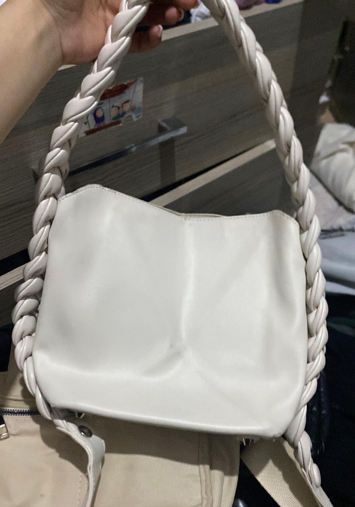 Beyaz deri malzemeden yapılmış, örgülü zincir askılı ve minimalist tasarıma sahip kadın çantası. Günlük kullanıma uygundur. hiç kullanılmamıştır