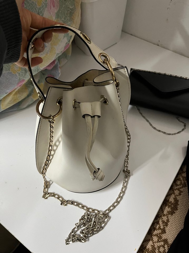 Beyaz deri, yılan desenli ve zincir detaylı kadın çantası. Bağcıklı kapanışı ve hafif şık görünümü vardır.