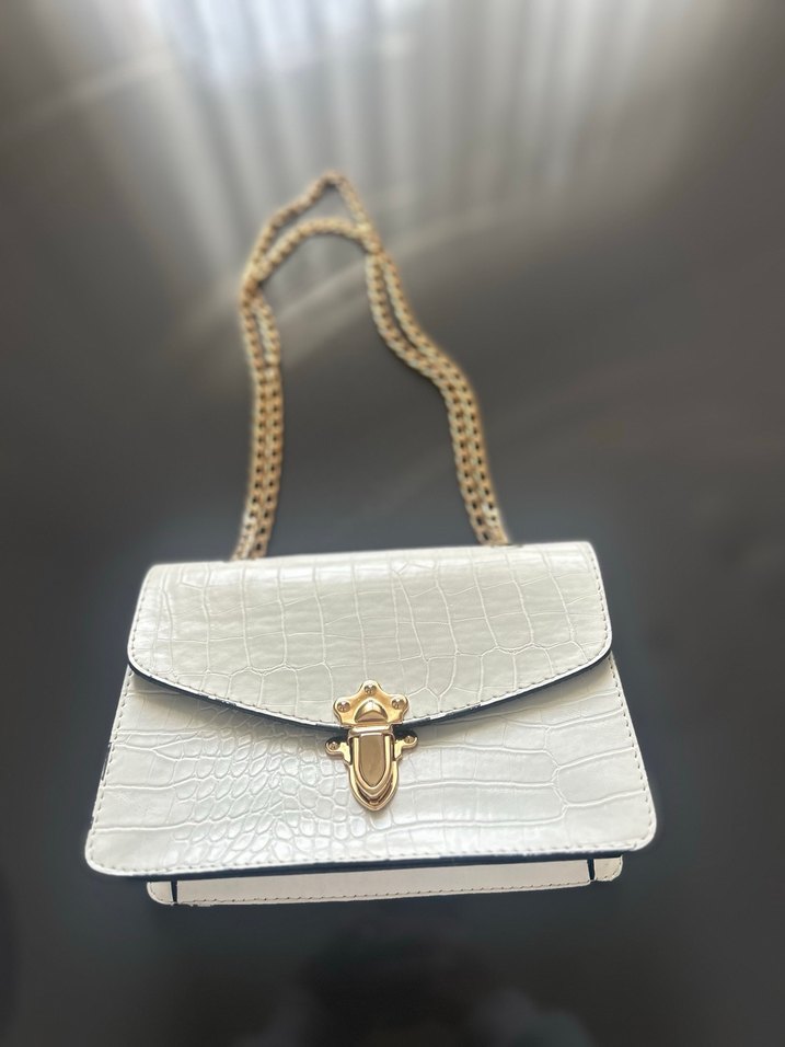 Beyaz deri, yılan desenli ve altın zincir askılı bu çanta, klasik zarafetle sokak stilini birleştirir.