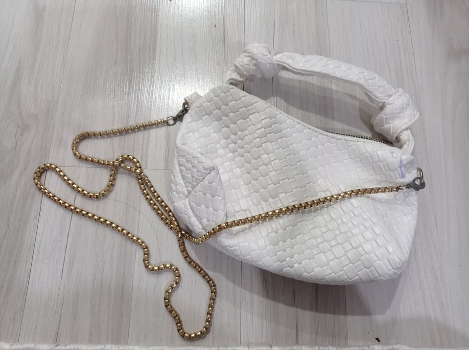 Beyaz deri çanta, yılan desenli ve parlak altın zincir detaylı, Paris sokak modası ve avangart tarzı bir arada sunuyor. lekeleri mevcuttur resimde göründüğü gibi .