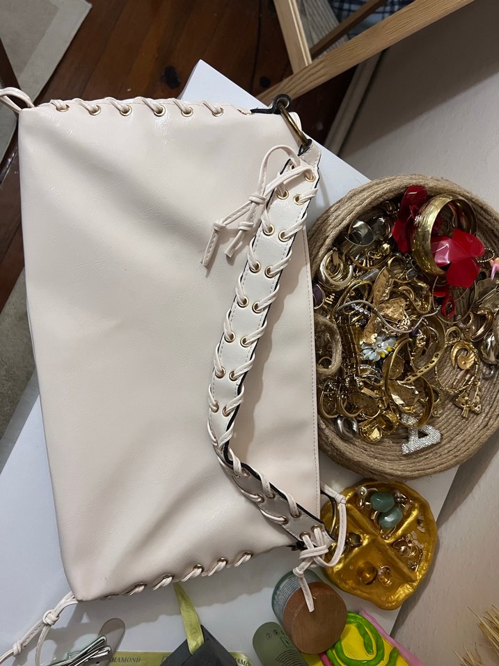 Zincir detaylı, yılan desenli beyaz deri kadın çantası, günlük kullanıma uygun bohem Paris tarzında.